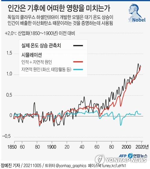 이날 노벨물리학상 수상자를 선정한 노벨위원회는 "그가 개발한 이론은 대기 온도 상승이 인간이 배출한 이산화탄소 때문이라는 것을 증명하는데 사용됐다"고 평가했다.