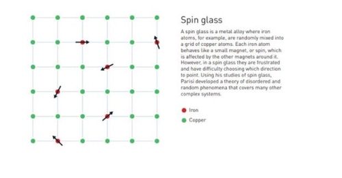 이런 특성을 지닌 시스템의 모델 중 '스핀 유리'(spin glass)라고 불리는 것이 매우 중요한데, 파리시는 1979년 이에 대한 풀이를 내놓아 이 분야 연구에 돌파구를 열었다. '유리'라는 표현은 비유를 위해 쓰인 단어이며, 우리가 흔히 보는 실제 유리를 가리키는 것은 아니다.