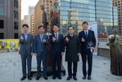 (샌프란시스코=연합뉴스) 정성호 특파원 = 재외공관에 대한 국정감사를 위해 미국을 방문한 국회의원들이 샌프란시스코의 위안부 기림비를 찾아 헌화했다.