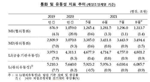 13일 한국은행의 '통화 및 유동성' 통계에 따르면 8월 평균 광의 통화량(M2 기준)은 3천494조4천억원으로, 7월(3천443조9천억원)보다 50조5천억원(1.5%) 늘었다. 1년 전과 비교하면 12.5% 증가했다.