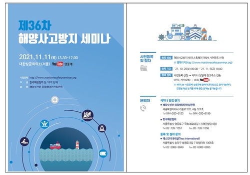 ▲ 해양수산부 중앙해양안전심판원은 한국해운협회 등 18개 해양·수산 단체와 함께 오는 11일 대한상공회의소에서 '제36차 해양사고방지 세미나'를 개최한다고 1일 밝혔다. 이번 세미나에서는 대형 컨테이너선의 접·이안 조종과 항만 안전, 자율운항선박 관련 해사 동향, 중대재해처벌법 시행 관련 준비 경과 등에 대해 논의될 예정이다. 온라인 참여를 희망할 경우 5일까지 해양사고방지 세미나 누리집(http://www.maritimesafetyseminar.org)에서 사전 등록을 하면 된다. (서울=연합뉴스)