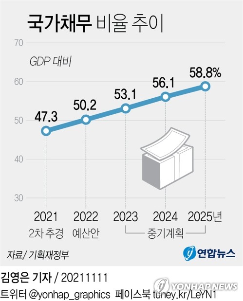 정부 역시 국내총생산(GDP) 대비 국가채무 비율이 올해 47.3%를 기록한 데 이어 ▲ 내년 50.2% ▲ 2023년 53.1% ▲ 2024년 56.1% ▲ 2025년 58.8% 등으로 가파른 상승 곡선을 예상하고 있다.