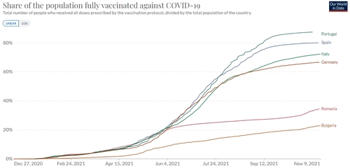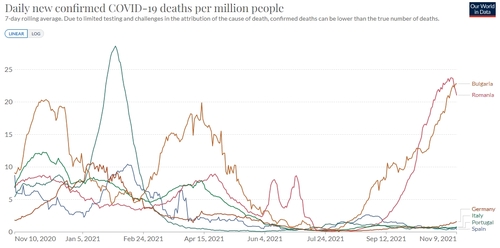 이달 1일 기준 백신 접종률은 포르투갈 87%, 이탈리아 72%, 독일 66%이지만, 사망자가 폭증한 불가리아와 루마니아에서는 각각 22%, 33%에 그쳤다.