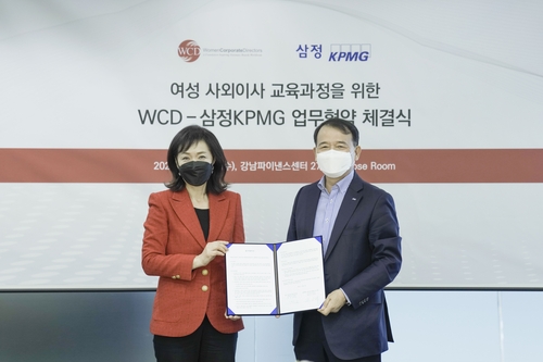 ▲ 삼정KPMG는 세계여성이사협회(WCD Korea)와 지난 1일 역삼동 본사에서 사외이사 양성 및 교육을 위한 협력을 담은 업무협약을 체결했다고 밝혔다. 양사는 협약에 따라 이사회의 다양성과 전문성을 높이기 위한 사외이사 교육 프로그램인 'WCD 사외이사 교육과정'을 공동 개발한다. WCD 사외이사 교육과정은 상장 대기업 이사회에 참가하는 사외이사 및 전·현직 기업 임원 등을 대상으로 하며, 이달 1일부터 삼정KPMG에서 운영하는 교육 플랫폼인 '삼정KPMG 아카데미'를 통해 무료로 수강할 수 있다. (서울=연합뉴스)
