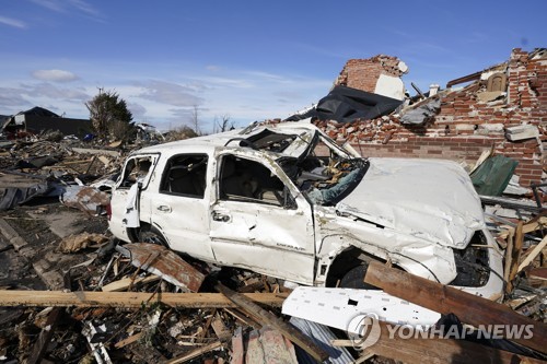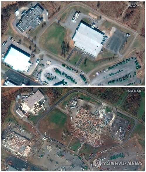 (서울=연합뉴스) 김연숙 기자 = 10일(현지시간) 토네이도(회오리바람)가 휩쓸고 간 미국 중부 켄터키주의 메이필드는 한 순간에 쑥대밭으로 변한 모습이었다.
