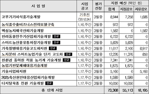 신규 사업은 반려동물 전주기 산업화 기술개발(67억원), 스마트 농산물 유통·저장기술 개발(58억원), 가축질병 대응기술 고도화 지원(110억원), 노지분야 스마트농업 기술 단기 고도화(122억원), 친환경 동력원 적용 농기계 기술 개발(73억원), 디지털 육종 전환기술 개발(101억원) 등이다.
