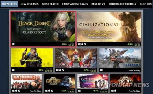 ▲ 펄어비스[263750]는 '검은사막'이 글로벌 게임 서비스 플랫폼 스팀에서 발표한 '2021 최고작' 최다 판매 부문(Top Sellers)에 선정됐다고 10일 밝혔다. 스팀은 매년 최고의 게임 Top 100을 ▲ 최다 판매 ▲ 인기 출시작 ▲ 최다 플레이 ▲ 얼리 액세스 졸업작 ▲ 베스트 VR ▲ 컨트롤러 지원 6개 부문으로 발표한다. 검은사막은 스팀이 지난해 총수익 기준 상위 100개 게임을 선정하는 최다 판매 부문에 국내 다중접속역할수행게임(MMORPG) 중 유일하게 이름을 올렸다. (서울=연합뉴스)