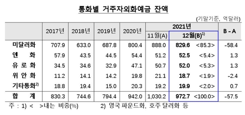 한국은행이 20일 발표한 '거주자 외화예금 동향'에 따르면 지난해 12월 말 기준 외국환은행의 거주자 외화예금 잔액은 972억7천만달러로 집계됐다.