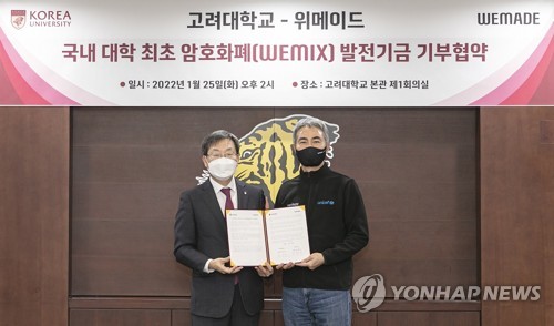 (서울=연합뉴스) 최현석 기자 = 위메이드[112040]는 25일 국내 대학 중 처음으로 고려대와 암호화폐 기부 협약식을 체결하고 10억원 상당의 암호화폐 위믹스(WEMIX)를 대학 측에 기부했다고 26일 밝혔다.