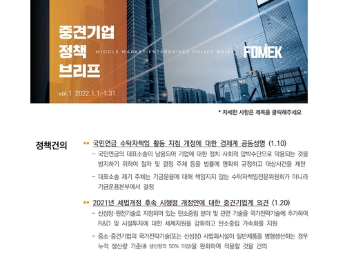 정부 부처와 국회 등 여러 인터넷 사이트에 산재된 중견기업 관련 정책과 입법·행정예고 등 주요 법·제도 동향을 한데 모아 일목요연하게 정리해 제공하는 서비스로, 매월 근무 시작일에 중견기업 임직원 4천600여명에게 발송된다.