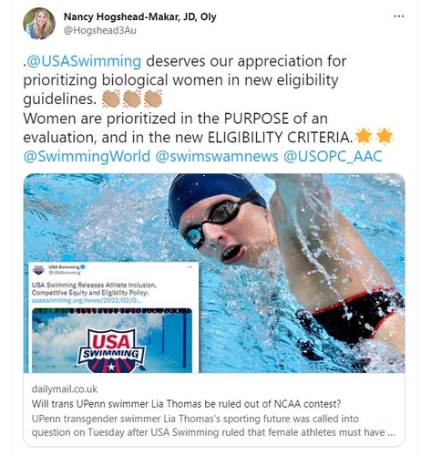1984년 LA올림픽 수영 금메달리스트이자 변호사인 낸시 혹스헤드-마커는 트위터에 "새로운 기준으로 생물학적 여성의 권익을 지킬 수 있게 해 준 수영협회에 감사하다"라고 적었다.