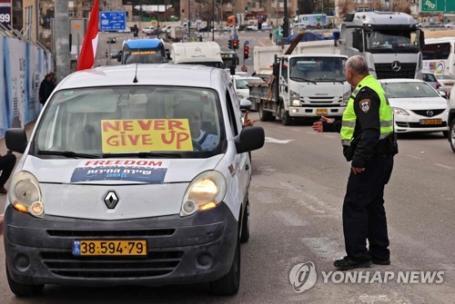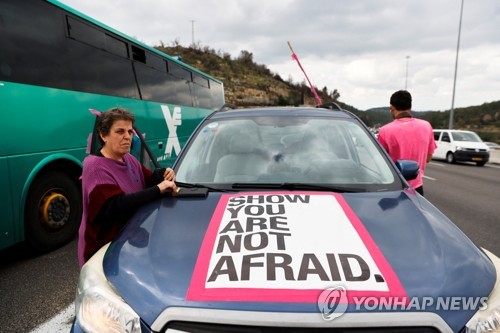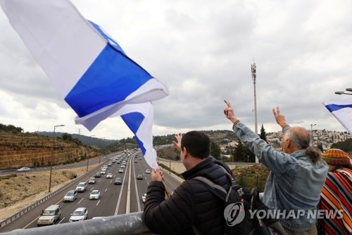 시위 참가자들은 도로를 지나는 차들을 향해 이스라엘 국기와 손을 흔들며 동참을 촉구합니다.