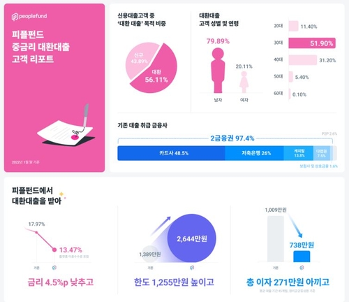 피플펀드는 올해 1월 말까지 신용대출을 받은 고객 8천13명 가운데 절반 이상인 56.11%가 기존 대출의 금리를 낮추거나 한도를 증액해 피플펀드 중금리 대출로 갈아탔다고 밝혔다.