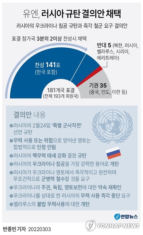 유엔은 2일(현지시간) 미국 뉴욕 유엔본부에서 우크라이나 사태에 관한 긴급특별총회를 열어 이런 내용의 결의안을 찬성 141표, 반대 5표, 기권 35표로 채택했다고 밝혔다.