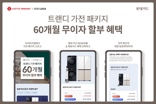 ▲ 롯데카드는 롯데하이마트[071840]와 디지로카앱에서 삼성전자[005930] 및 LG전자[066570]의 가전 패키지 상품을 대상으로 최대 60개월 무이자 할부 행사를 내달 30일까지 한다고 21일 밝혔다. 삼성전자와 LG전자의 '비스포크'와 '오브제컬렉션' 가전 패키지 상품을 최대 60개월 무이자 할부와 제휴카드 할인으로 구매할 수 있다. 무이자 할부 기간은 48개월과 60개월 중 선택할 수 있다. 제휴카드인 'Hi-Plan by 롤라 롯데카드' 혜택을 적용하면 정상가의 최대 27%까지 할인된다. (서울=연합뉴스)