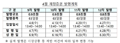 (세종=연합뉴스) 곽민서 기자 = 기획재정부는 4월 중 3조5천억원 규모의 재정증권(63일물)을 총 4회에 걸쳐 발행할 예정이라고 1일 밝혔다.