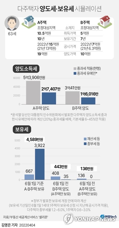(세종=연합뉴스) 박용주 차지연 기자 = 다주택자에 부과하는 양도소득세 중과세율을 한시적으로 완화하는 조치가 내달 10일 윤석열 정부 출범 이후에 시행된다.