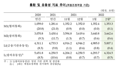 (서울=연합뉴스) 신호경 기자 = 가계가 주식·가상화폐 등을 팔아 예·적금에 넣고 기업의 대출도 이어지면서 지난 2월 통화량이 약 22조원 불었다.