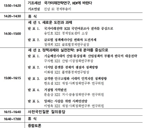 기조연설에 이어 KDI 연구위원들이 주제별 발표를 한 뒤 종합토론을 진행한다.