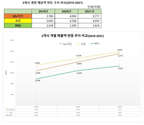 개별 기준 지난해 매출은 교촌에프앤비 4천935억원, bhc 4천771억원, BBQ 3천624억원이다.