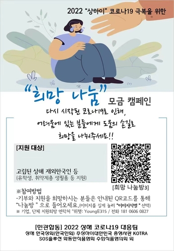 (상하이=연합뉴스) 차대운 특파원 = 보름 이상 이어지고 있는 도시 봉쇄로 어려움을 겪는 상하이 교민들이 형편이 특히 어려운 유학생들과 교민들을 위한 모금 운동에 나섰다.