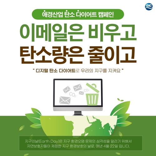 애경산업[018250]은 '디지털 탄소 다이어트'를 콘셉트로 한 사내 캠페인을 벌인다. 이메일 1통을 저장하는 데 이산화탄소 4g이 발생하는 만큼 임직원 1명당 50개 이상의 이메일을 비워 탄소배출을 줄이는 내용이다.
