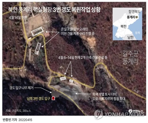 (서울=연합뉴스) 차병섭 기자 = 북한이 풍계리 핵실험장의 3번 갱도를 복구하기 위한 작업을 계속하고 있다고 미국 북한전문매체 '38노스'가 28일(현지시간) 보도했다.