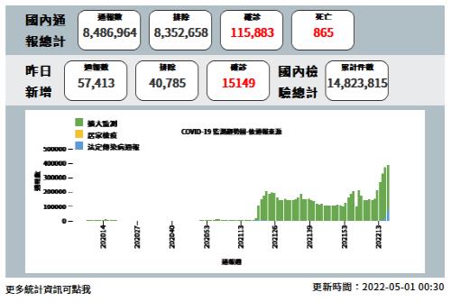 1일 연합보와 자유시보 등 대만언론에 따르면 대만 보건당국은 전날 신규환자가 모두 1만5천149명으로 이중 지역사회 감염 환자는 1만5천33명, 해외 유입 환자는 116명, 사망자는 3명이라고 밝혔다.