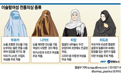 히잡은 머리카락만 가리지만, 부르카는 눈 부위만 망사로 돼 있고 전신을 가리는 복장이다.