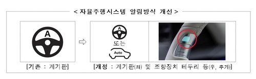 자율주행시스템 작동상태 알림 방식과 관련해선 계기판 외에 핸들 테두리 등에도 별도의 시각 장치를 추가하고 자율주행 해제 시에도 운전자에게 별도 알림 서비스를 제공하도록 했다.