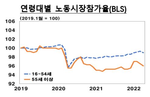 한국은행 조사국 모형연구팀 오태희 과장과 이솔빈 조사역은 30일 발표한 보고서 '코로나19가 미국 고령층의 노동 선택에 미친 영향'에서 "미국에서 55세 이상 고령층의 경제활동참가율은 여전히 코로나19 위기 이전 수준을 상당폭 하회하고 있다"며 이같이 밝혔다.