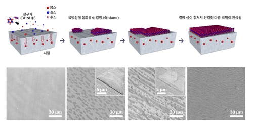 신 교수가 이끄는 연구팀은 합성에 필요한 재료의 농도를 조절하는 새로운 합성 방식을 도입해 단결정 니켈(Ni) 기판 위에서 여러 층의 단결정 박막을 '에피택시 성장'(epitaxy growth) 시켰다.