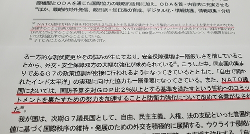 기본방침은 이와 관련해 "북대서양조약기구(NATO·나토) 제국(諸國)에서는 국방예산을 국내총생산(GDP) 대비 2% 이상으로 하는 기준을 만족시킨다는 서약을 향한 약속을 이행하기 위한 노력을 가속하는 것과 방위력 강화에 관해서 다시 합의가 이뤄졌다"고 소개했다.