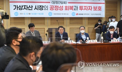 (서울=연합뉴스) 홍지인 이지헌 김유아 홍준석 기자 = 국민의힘과 정부는 13일 가상화폐 투자자 보호를 위한 두 번째 정책간담회에서 최근 루나·테라USD(UST) 폭락 사태 재발을 막을 실효성 있는 자율 규제 방안을 주문했다.