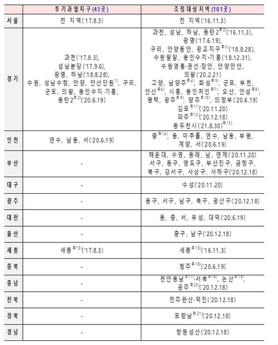 (세종=연합뉴스) 김동규 기자 = 집값 상승 폭이 비교적 낮고 미분양 증가세가 뚜렷한 대구와 대전, 경남지역 6개 시군구에 대한 투기과열지구 지정이 해제된다.