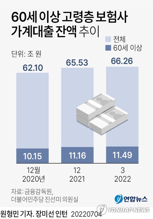 (서울=연합뉴스) 오주현 기자 = 지난해 만 60세 이상 고령층이 보험사에서 받은 가계대출이 1년 새 10% 급증한 것으로 나타났다.