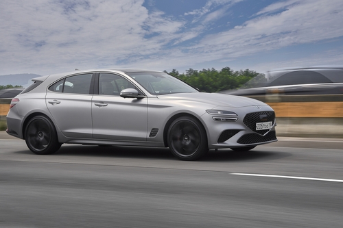 '날렵하게 잘 빠진' 전면부는 G70답게 여전했다. 제네시스 로고의 방패에서 영감을 받은 크레스트 그릴과 긴 후드(엔진룸 덮개), 짧은 프런트 오버행(범퍼부터 앞바퀴까지)에서 제네시스의 고급스러움이 묻어났다. 두 줄 쿼드 램프에서는 스포츠세단의 역동성도 나타났다.