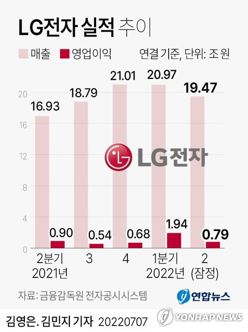 이번 2분기와 동일한 기준을 적용하면 지난해 2분기 매출액과 영업이익은 각각 16조9천323억원, 9천1억원이라고 LG전자는 전했다.