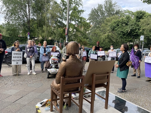 베를린 평화의 소녀상 앞에서는 지난달 26∼30일 주옥순 엄마부대 대표 등 한국 극우단체 소속 4명이 "소녀상을 철거하라"며 원정시위를 했다. 기시다 후미오 일본 총리가 올라프 숄츠 독일 총리에게 베를린 평화의 소녀상 철거를 요청한 데 이어 주요7개국(G7) 정상회의가 열린 시점이었다. 이들은 귀국후 추후 일본 극우와 함께 재차 베를린 소녀상앞 시위에 나서겠다고 밝혔다.
