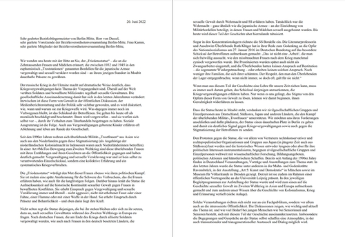 이들은 슈테판 폰다셀 미테구청장과 옐리자베타 캄 미테구의회 의장, 미테구의회를 호명하면서 "평화의 소녀상이 베를린에 영원히 머물게 해 전시성폭력과 그 피해자들에 대한 낙인에 반대하는 뚜렷한 반대의 신호를 보내기 바란다"고 촉구했다.