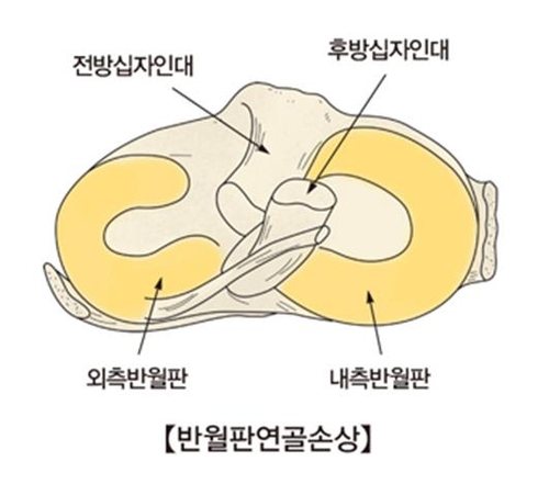 반월판 연골이란 무릎 위아래 관절 사이에 있는 반달 모양의 연골로 무릎 관절을 보호하고 무릎이 받는 충격을 완화한다.