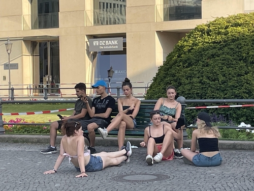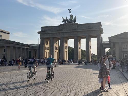 베를린 관광명소 브란덴부르크문 앞 광장은 평소보다 한산한 가운데, 가벼운 옷차림으로 벤치나 땅바닥에 앉아 음료수를 마시며 휴식하는 관광객들의 모습이 눈에 띄었다.