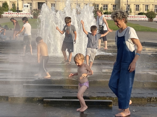 잔디밭 중간의 분수대에서는 어린이들이 소리를 지르며 물놀이를 즐겼다.