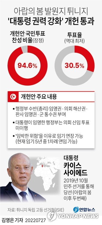(카이로=연합뉴스) 김상훈 특파원 = '아랍의 봄' 혁명 발원지인 북아프리카 튀니지에서 대통령에게 막강한 권력을 집중하는 내용의 헌법 개정이 이뤄졌다.