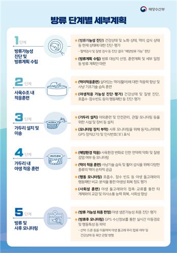 비봉이 해양방류는 ▲ 방류 가능성 진단 및 방류계획 수립 ▲ 사육수조 내 적응훈련 ▲ 가두리 설치 및 이송 ▲ 가두리 내 야생적응 훈련 ▲ 방류 및 사후 모니터링 등 5단계로 진행되는데 비봉이는 조만간 3∼4단계 과정에 들어간다.