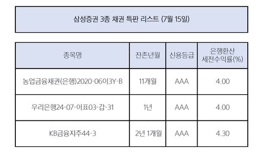 특판 채권은 'KB금융지주44-3', '우리은행24-07-이표03-갑-31', '농업금융채권(은행)2020-06이3Y-B' 3종으로 모두 신용등급 'AAA'의 선순위 채권이다.