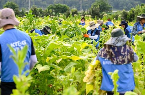 ▲ KT&G는 일손 부족으로 어려움을 겪는 잎담배 농가를 돕기 위해 잎담배 수확 봉사활동을 진행했다고 8일 밝혔다. KT&G 원료본부와 경북 김천시 소재 KT&G 김천공장 소속 직원들은 지난 5일 경북 문경시 가은읍에 있는 잎담배 농가를 찾아 약 1만5천㎡(4천500평) 규모 농지에서 잎담배 수확을 도왔다. (서울=연합뉴스)