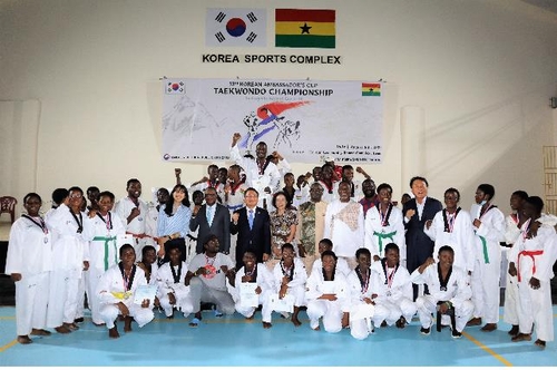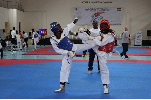 ▲주가나 한국대사관(대사 임정택)은 한-가나 수교 45주년을 맞아 지난 6일(현지시간) 가나 테마시(市)에 있는 한인회관에서 '제12회 가나 대사배 태권도 대회'를 개최했다고 8일 밝혔다. 팬데믹(전염병의 세계적 대유행)으로 3년 만에 재개된 이번 대회에는 가나태권도협회의 협조 가운데 겨루기 18개 체급과 품새 종목에서 총 80여 명의 남녀 선수가 참가했다. (요하네스버그=연합뉴스)