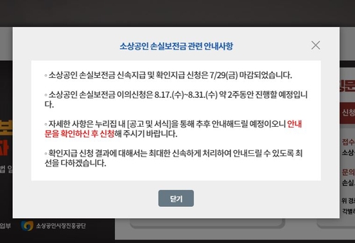 중소벤처기업부는 9일 참고자료를 내고 "손실보전금 신청시스템 팝업 창에 이의신청 기간을 17∼31일로 공지했다"고 밝혔다.