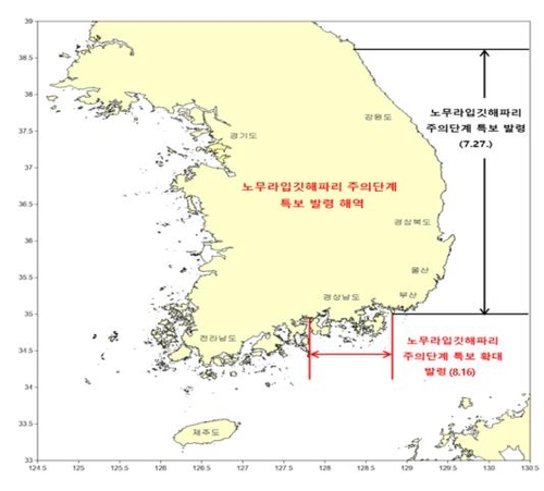 임태호 해수부 수산자원정책과장은 "노무라입깃해파리가 경남 해역에서도 관찰됨에 따라 주의단계 특보를 경남해역까지 확대 발령했다"며 "정부와 지자체는 피해가 발생하지 않도록 해파리 상황을 지속적으로 모니터링하고 제거작업에 나설 계획"이라고 말했다.